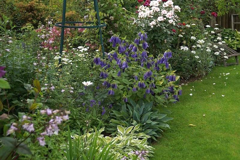 Bisher zeigte ich dir Bilder aus unserem Schaugarten. Mit den Jahren besucht man ja die unterschiedlichsten Gärten, aus jedem kann man dazulernen und ich empfinde dies als eine große Bereicherung. Um so mehr ist es mir ein Anliegen, dir auch mal einen Ausschnitt des Gartens von Doris zu zeigen. Doris ist seit früher Zeit eine begnadete Pflanzensammlerin, eine Kundin der ersten Stunde und eine begeisterte Besucherin von Gartentagen. Mit ihrem Mann reiste sie unzählige Male nach Großbritannien, um die dortigen Gärten zu bewundern. Funkien, Clematis und Rosen, alles geschmackvoll miteinander verquickt, in der Mitte siehst du unschwer Campanula ‘Sarastro’ in der Vollblüte. Dazwischen aber immer wieder auch Einjährige, wie Orlaya grandiflora oder kurzlebige Bartfäden und anderes mehr!’’