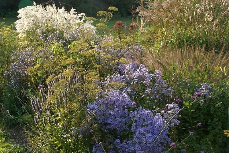 Beim folgenden Beet schätze ich die so unglaublich abwechslungsreiche Dynamik, welche dich sogar über einige Jahre in Bann halten kann. Diese Aufnahme aus unserem Schaugarten habe ich vor etwa 12 Jahren gemacht. Wie interessant wäre es doch gewesen, wenn ich diese Ecke jedes Jahr zur gleichen Zeit aufgenommen hätte! So könnte ich dir aufzeigen, wie Fenchel, Anis-Ysop und das Lampenputzergras über die Jahre die Szenerie unterschiedlich beherrschen. Der Fenchel (Foeniculum vulgare ‘Atropurpureum’) ist zweijährig, im ersten Jahr umspielt er mit seinen filigranen, duftigen Blättern alles Danebenstehende, im zweiten Jahr dominieren seine Dolden und er sät sich aus. Der Anisysop ist prinzipiell nur kurzlebig, die beste Sorte ist ‘Blue Fortune’, die du auf dem Bild siehst. Sie hält zumindest einige Jahre aus. Und ohne die entsprechenden Bilder musst du mir jetzt vertrauen, wenn ich dir erzähle, dass über viele Jahre nur das Chinaschilf (Miscanthus sin. ‘Aldebaran’) und die Wildaster (Aster turbinellus) bestehen blieben, alles andere wechselte sich ab, ja selbst das Lampenputzergras säte sich aus, ohne dabei überhand zu nehmen. Alles, was uns zu viel erschien, wurde entweder verpflanzt oder ausgehackt. Ganz am Beetrand erfreuen uns jedes Jahr von neuem im Herbst die immer breiter werdenden Herbstzeitlosen. Sie läuten den Herbst ein, sie sind so toll!